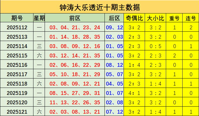 上期回顾:上期奖号:前区02 03 08 13 21,后区07 12;前区号码奇偶比3:2,大小比为1:4,开出重号1个,连号1组。