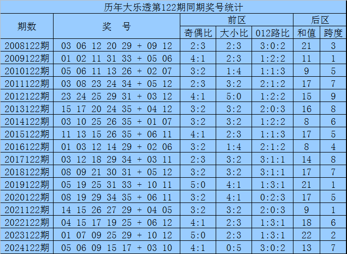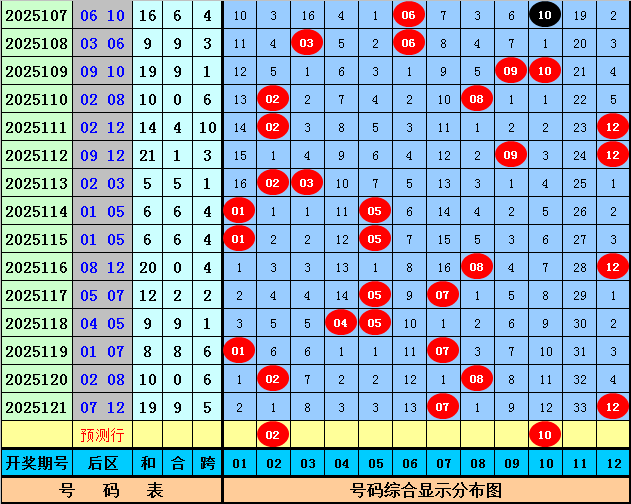 后区分析:在第122期历史同期开奖中,和值大小为11:6,跨度奇偶比为11:6,本期后区注意两码02和10。