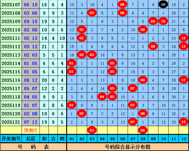 后区分析(一区01-04,二区05-08,三区09-12):上期后区开出奖号07和12,最近10期后区三区落号比为7:15:4,本期后区关注号码03、05、08、10、11,后区两码参考03、08。