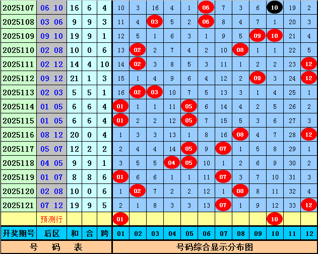 后区分析:上期后区开出1路+0路号07和12,最近30期后区奖号012路比为17:20:23,最近10期后区奖号012路比为5:7:8,本期后区注意号码01、03、06、09、10,单挑两码组合01、10。