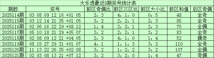 大乐透第2025121期奖号为:前区:02、03、08、13、21,后区:07、12。其中前区奇偶比为3:2,大小比为1:4,三区比为3:2:0,和值为47。