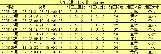 大乐透第2025121期奖号开出:02 03 08 13 21 +07 12。其中前区三区比为3:2:0,012路比为2:1:2,后区开出全大、一奇一偶奖号。