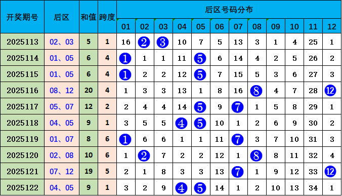 后区分析:上期后区开出04 05,跨度1,近十期跨度是:1、4、4、4、2、1、6、6、5、1,波动范围较大,跨度范围在1-6之间,本期预计跨度值上升,重点关注号码05 11,跨度6。