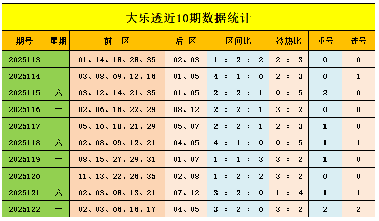 上期回顾:大乐透第2025122期奖号为:前区02、03、06、16、17,后区04、05,前区奖号三区比为3:2:0,冷热比为3:2,后区开出小小组合04、05