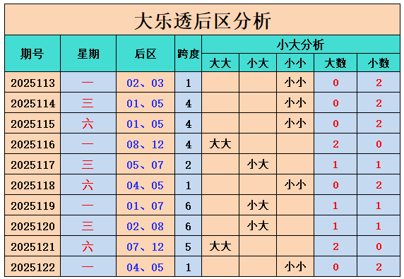 最近10期后区大小比为9:11,最近10期后区大大组合开出1期,小大组合开出7期,小小组合开出2期。上期开出小小组合,本期看好小大组合出现。