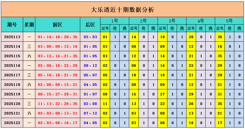 前区四号球:上期开出奖号16,与前期相比上升3点位,小于近10期4号球平均值20,本期预计点位下降,近10期开出的四号球中有4个奖号为奇数,上期四号球开出偶数,本期四号球推荐奖号23