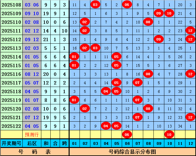 后区分析(一区01-04,二区05-08,三区09-12):上期后区开出奖号04和05,最近10期后区三区落号比为8:17:2,本期后区关注号码05、06、07、08、10,后区两码参考06、10。