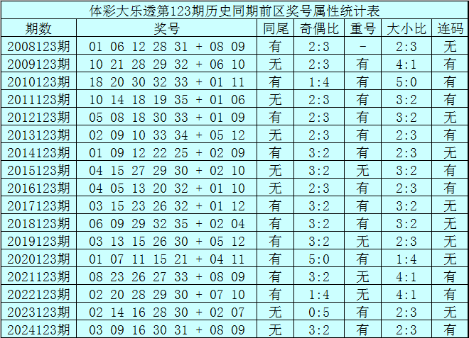 体彩大乐透第123期历史同期开出17次奖号,其统计详见下表: