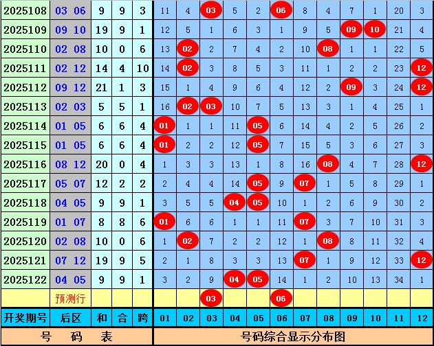 后区号码分析:在第123期历史同期开奖中奖,奖号01 09出现5次,奖号02 10出现4次,奖号08 12出现3次,奖号04 05 06 07 11出现2次,奖号03没有出现。本期后区五码参考03、06、08、09、12。