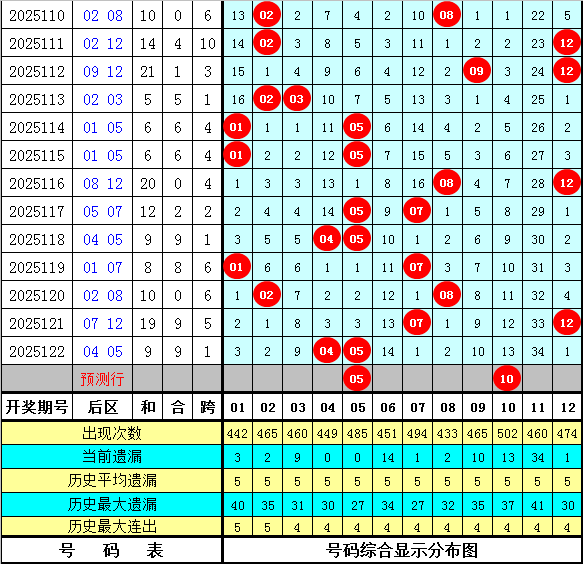 和值跨度:上期和值开出44,对比第2025121期和值下降了3个点位,本期预计和值在大号区域热出,看好出现在92周围。