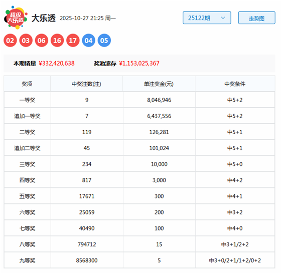 上期开奖:体彩大乐透第2025122期开奖号码为:02 03 06 16 17 + 04 05。