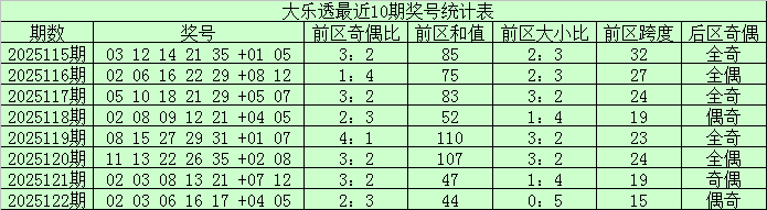 后区奇偶:最近30期后区奖号奇偶比为26:34,偶数号码出现较多,近10期号码奇偶比为12:8,奇数号码较热,本期后区关注全奇组合。