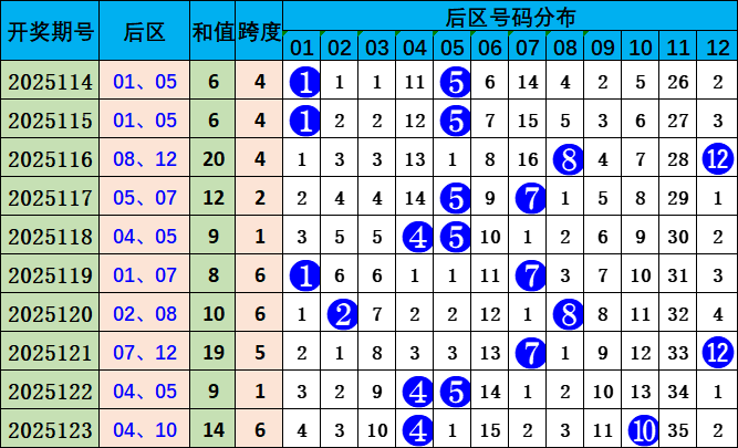 上期后区开出:04 10。和值为14,较上一期上升;跨度为6,较上一期上升。本期预测和值下降,推荐和值7;跨度下降,推荐跨度为5。本期后区推荐:01 06。