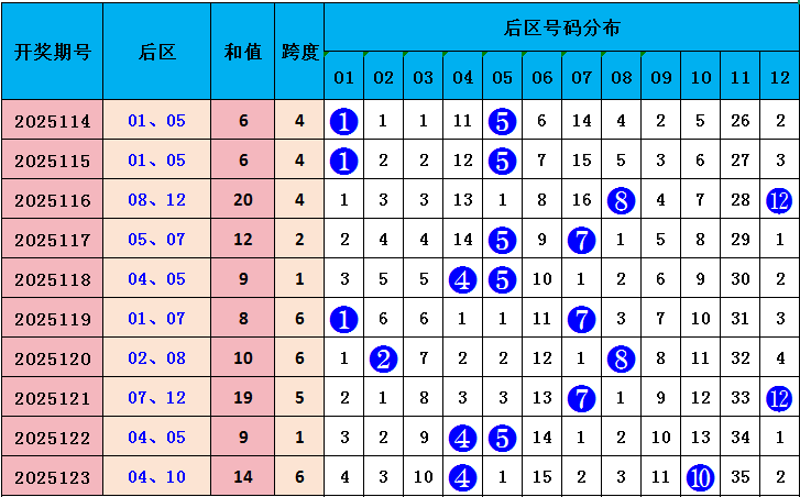 后区分析:上期后区开出04 10,和值14,较上期和值持平,本期预计和值会上升,看好号码05 12,和值17。