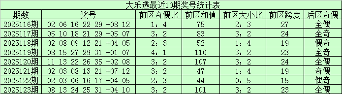大乐透第25123期奖号为:08、13、24、25、31+04、10。其中前区和值为101,奇偶比为3:2,大小比为3:2。后区为一大一小、全偶组合。