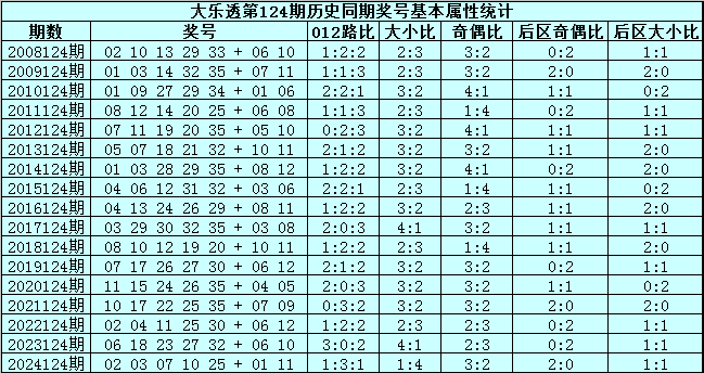 大乐透第2025124期历史同期号码分析: