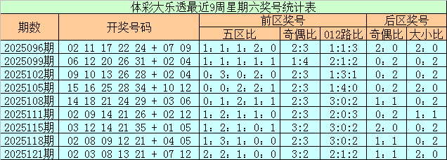 上期回顾:体彩大乐透上周星期六(第2025121期)奖号为02 03 08 13 21 + 07 12,前区奖号五区比为2:2:1:0:0,奇偶比为3:2,012路比为2:1:2,后区奖号奇偶比为1:1,大小比为2:0。