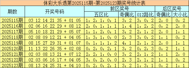 体彩大乐透第2025123期奖号为08 13 24 25 31 + 04 10,前区号码五区比为0:2:0:2:1,奇偶比为3:2,012路比为1:3:1,后区号码奇偶比为0:2,大小比为1:1。