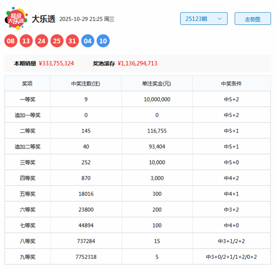 大乐透第2025123期开奖,前区:08、13、24、25、31;后区:04、10。其中前区012路比为1:3:1,奇偶比为3:2,和值为101,跨度为23,后区开出1路+1路号码。