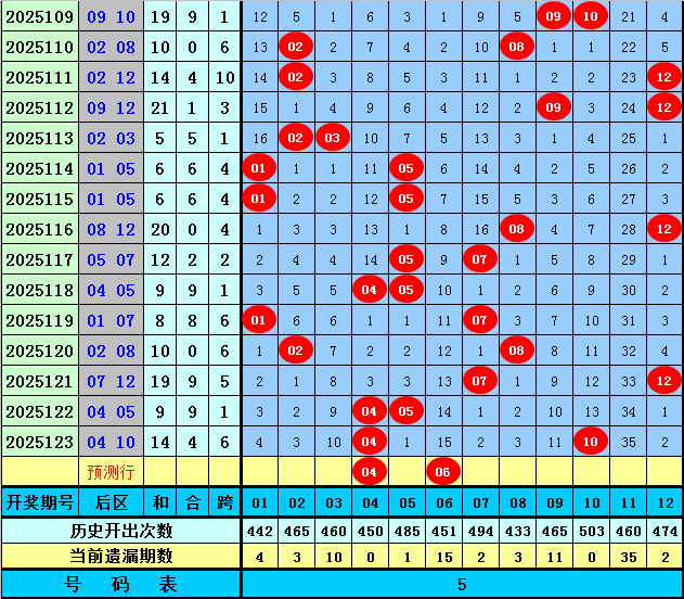 后区分析【一区01-04,二区05-08,三区09-12】:上期后区奖号为04和10,分别落在第一、三区,近50期后区三区比为37:33:30,近10期三区比为7:10:3,本期注意第一、二区号码出现,关注两码04+06。