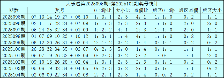 赵研大乐透第2025105期奖号012路分析: