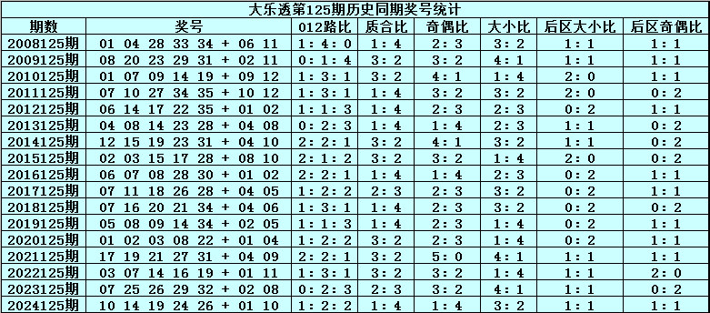 体彩大乐透第2025125期历史同期开奖号码分析: