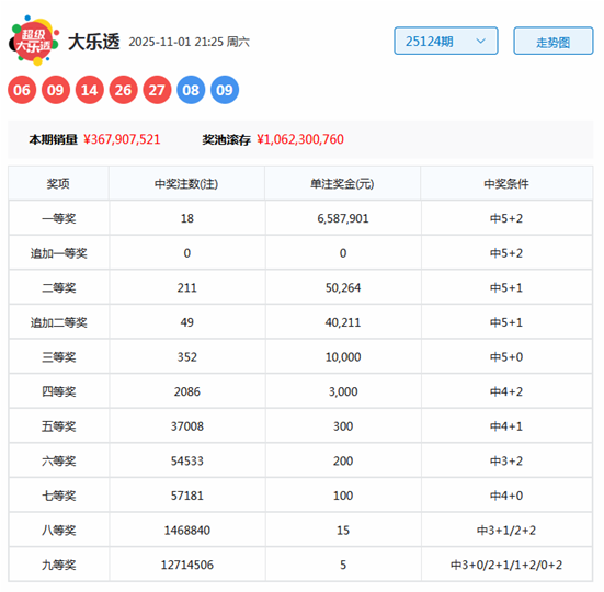 上期开奖:体彩大乐透第2025124期开奖号码为:06 09 14 26 27 + 08 09。