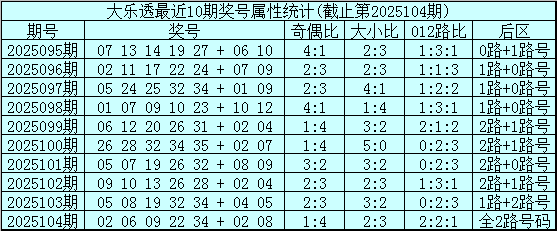大乐透第2025104期开奖号码:02 06 09 22 34 + 02 08。前区奖号大小比为2:3,奇偶比为1:4,012路比为2:2:1,后区为全2路号码。