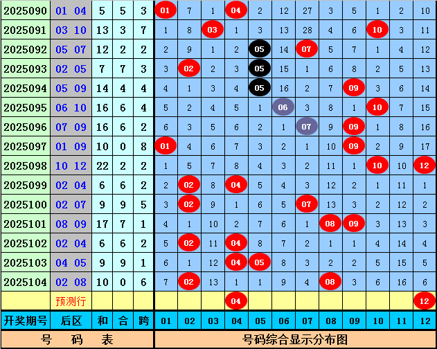后区上期开出奖号02和08,该组合历史上出现了42次,其下期奖号频次分别为:号码07出现12次,03出现11次,04出现9次,05、10、12出现7次,06、09、11出现6次,02出现5次,01出现4次,08出现2次,本期后区参考号码04、05、09、12,精选两码04和12。