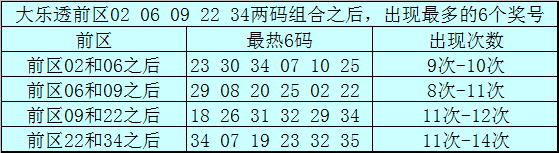 前区两码02和06和之后表现最热的6个号码为:23、30、34、07、10、25;