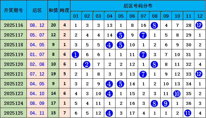 后区分析:上期后区开出04 11,跨度7,近十期跨度是:4、2、1、6、6、5、1、6、1、7,波动范围较大,跨度范围在1-7之间,本期预计跨度值不变,重点关注号码01 08,跨度7。