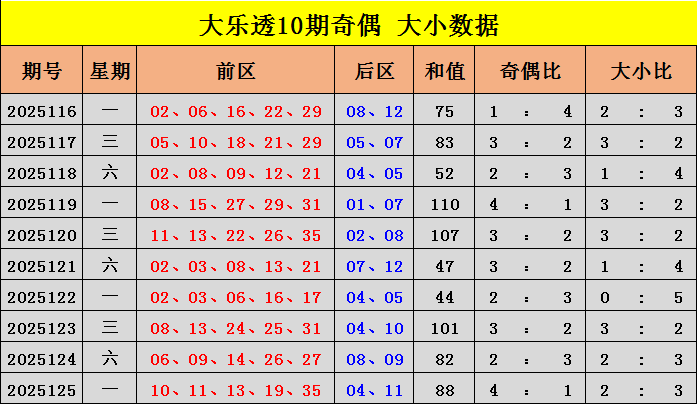 大乐透第25125期开奖。当期开奖号码为:前区10 11 13 19 35,后区04 11。当期前区号码大小比为2:3,奇偶比为4:1,三区比2:2:1;前区开出1组连号10 11;后区开出小大组合04 11。