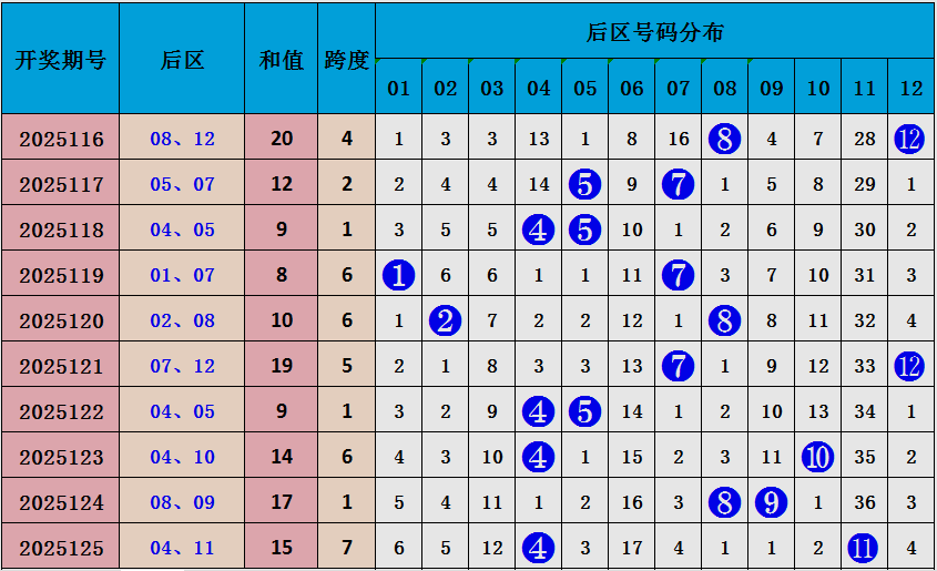 后区分析:上期后区开出04 11,和值15,较上期和值下降,本期预计和值会下降,看好号码01 07,和值8。