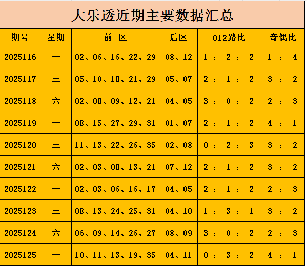 大乐透上期开期奖号为:10 11 13 19 35,后区04 11;012路比0 : 3 : 2,奇偶比4 : 1。