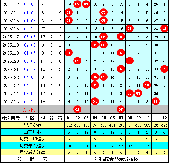 后区分析:在第126期历史同期开奖中,后区奖号全偶组合开出5次,一奇一偶组合开出9次,全奇组合开出3次,本期后区预计出现一奇一偶组合,看好号码02、06、07、11。