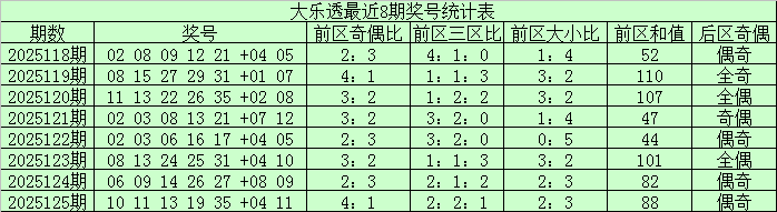 大乐透第2025125期奖号为:前区:10、11、13、19、35,后区:04、11。其中前区奇偶比为4:1,大小比为2:3,三区比为2:2:1,和值为88。