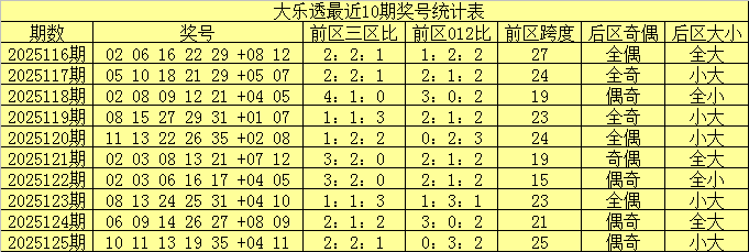 大乐透第2025125期奖号开出:10 11 13 19 35 +04 11。其中前区三区比为2:2:1,012路比为0:3:2,后区开出一大一小、一奇一偶奖号。