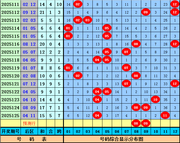 后区号码分析:在第126期历史同期开奖中奖,奖号06出现5次,奖号08 12出现4次,奖号01 03 05 10出现3次,奖号04 07 09 11出现2次,奖号02出现1次。本期后区五码参考02、03、06、08、09。