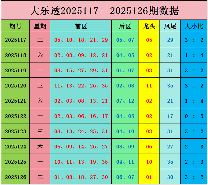 大乐透第2025126期奖号为:前区01 08 18 27 30,后区06 07;奇偶比2:3,大小比:3:2