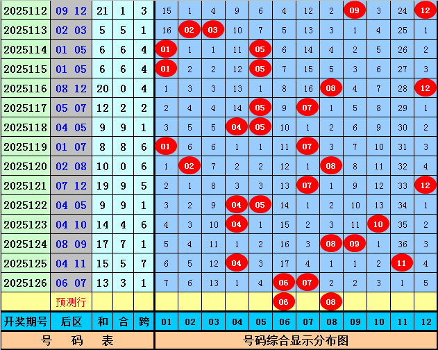 后区号码分析:第127期历史同期开奖中,后区两码一大一小开出11次,全大开出5次,全小开出1次,本期后区预计出现一大一小奖号,参考号码05、06、08、12。