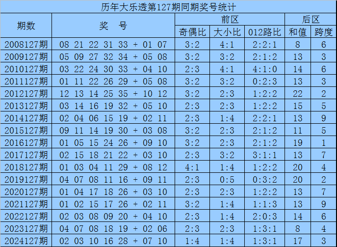 袁军师体彩大乐透第2025127期历史同期奖号分析: