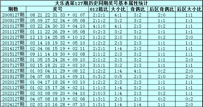 大乐透第2025127期历史同期号码分析: