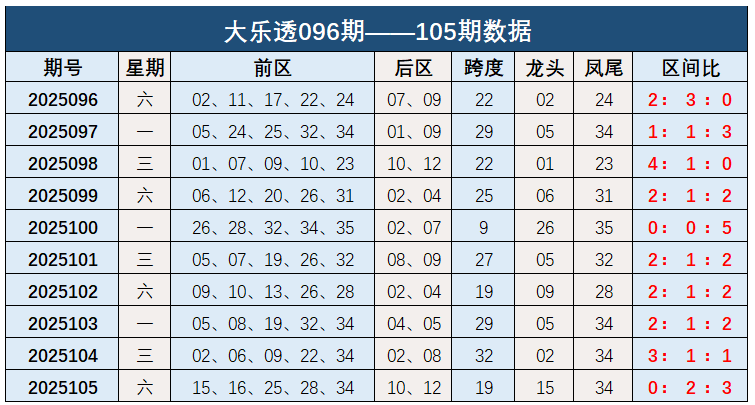 大乐透第2025105期出奖号统计:前区15、16、25、28、34,后区10、12。前区跨度19,龙头15,凤尾34,区间比比0:2:3。