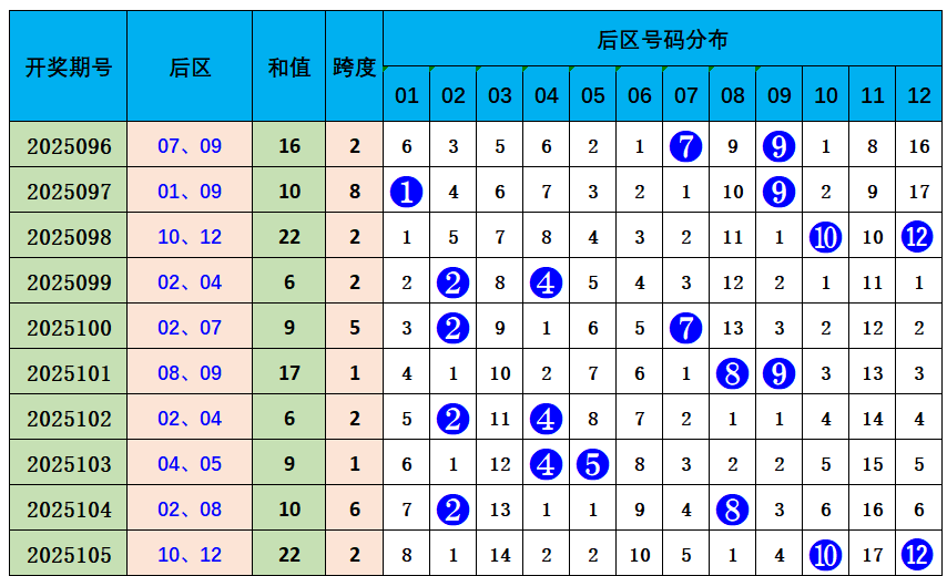 后区上期开出号码10、12,为偶偶组合,近十期后区奇偶比为7:13,偶数走势较高,本期后区参考奇偶比1:1,重点两码推荐01、12。
