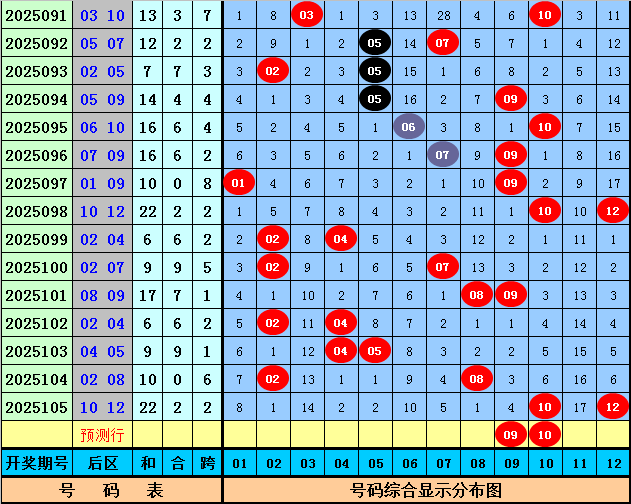 后区分析:在第106期历史同期开奖中,和值大小为9:8,跨度奇偶比为9:8,本期后区注意两码09和10。