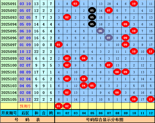 后区分析:上期后区为全偶号码10+12,最近10期后区号码奇偶比为7:13,最近50期后区奇偶比为50:50,本期后区参考一奇一偶组合,关注两码01、02。