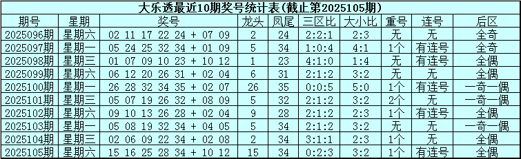 大乐透第2025105期奖号为:15、16、25、28、34+10、12。其中前区三区比为0:2:3,大小比为3:2,包含1个重号,包含连号,后区为全偶号码。