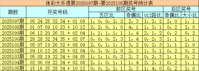 体彩大乐透第2025105期奖号为15 16 25 28 34 + 10 12,前区号码五区比为0:0:2:2:1,奇偶比为2:3,012路比为1:4:0,后区号码奇偶比为0:2,大小比为2:0。