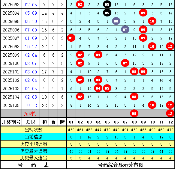 石浩第2025106期大乐透后区分析:后区上周星期一后区奖号为04和05,上期开出奖号10和12,最近9周星期一与最近9期后区奖号大小比分别为8:10和9:9,奇偶比分别为13:5和5:13,本期看好后区出现全偶组合,关注号码06、08、10、12。