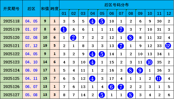 后区分析:上期后区开出05 08,跨度3,近十期跨度是:1、6、6、5、1、6、1、7、1、3,波动范围较大,跨度范围在1-7之间,本期预计跨度值上升,重点关注号码01 09,跨度8。